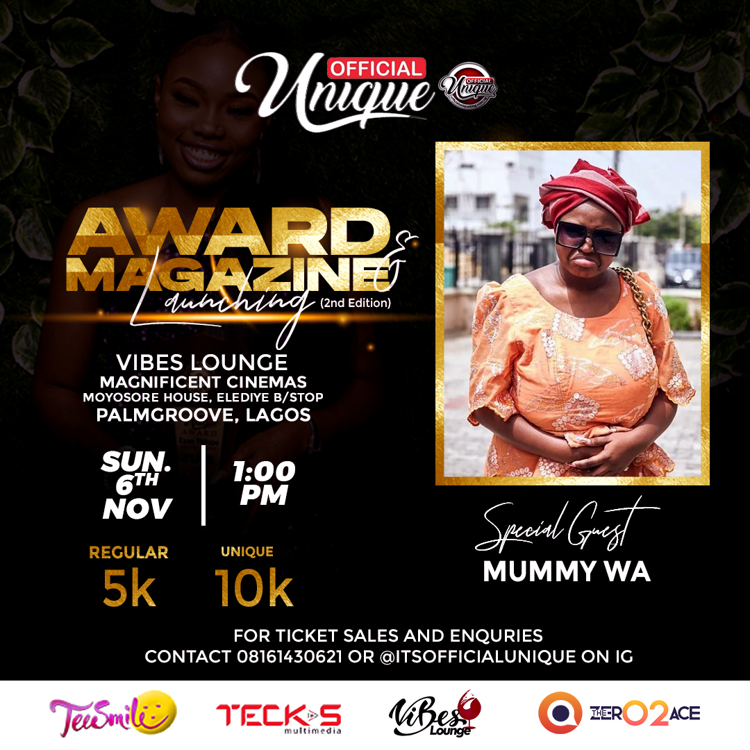 Again, this November, the 2nd edition of Official Unique Award and Magazine is set to feature top personals in the entertainment industry and it is with delight that we say that Mummy Wa, Peter Ijagbemi, Ajimovoix (Focus Beat Originator) and others will be at the event.