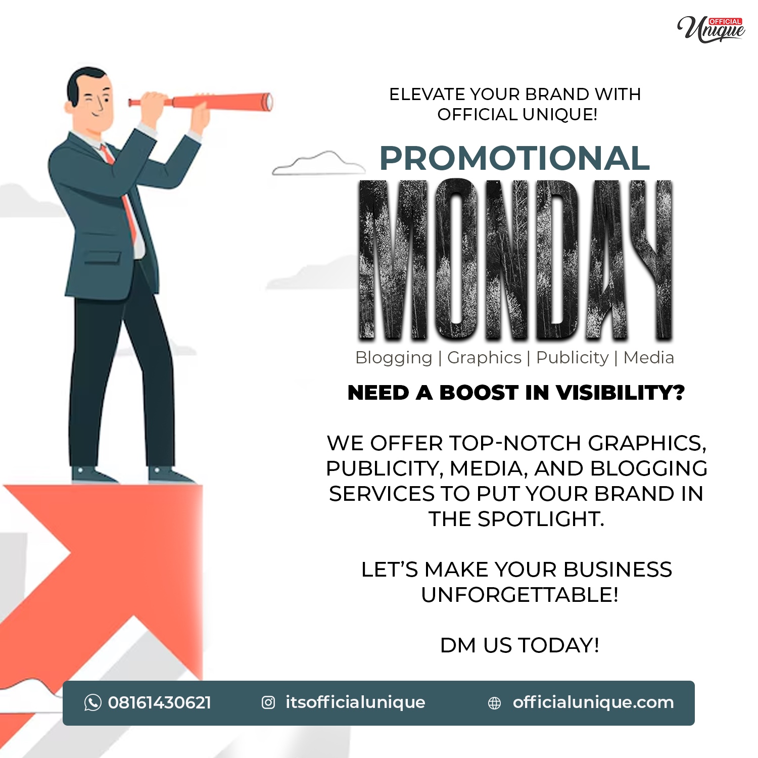 Are you looking to give your brand the visibility it deserves? Welcome to Promotional Monday with Official Unique, where we take your business to new heights with our top-tier blogging, graphics, publicity, and media services!