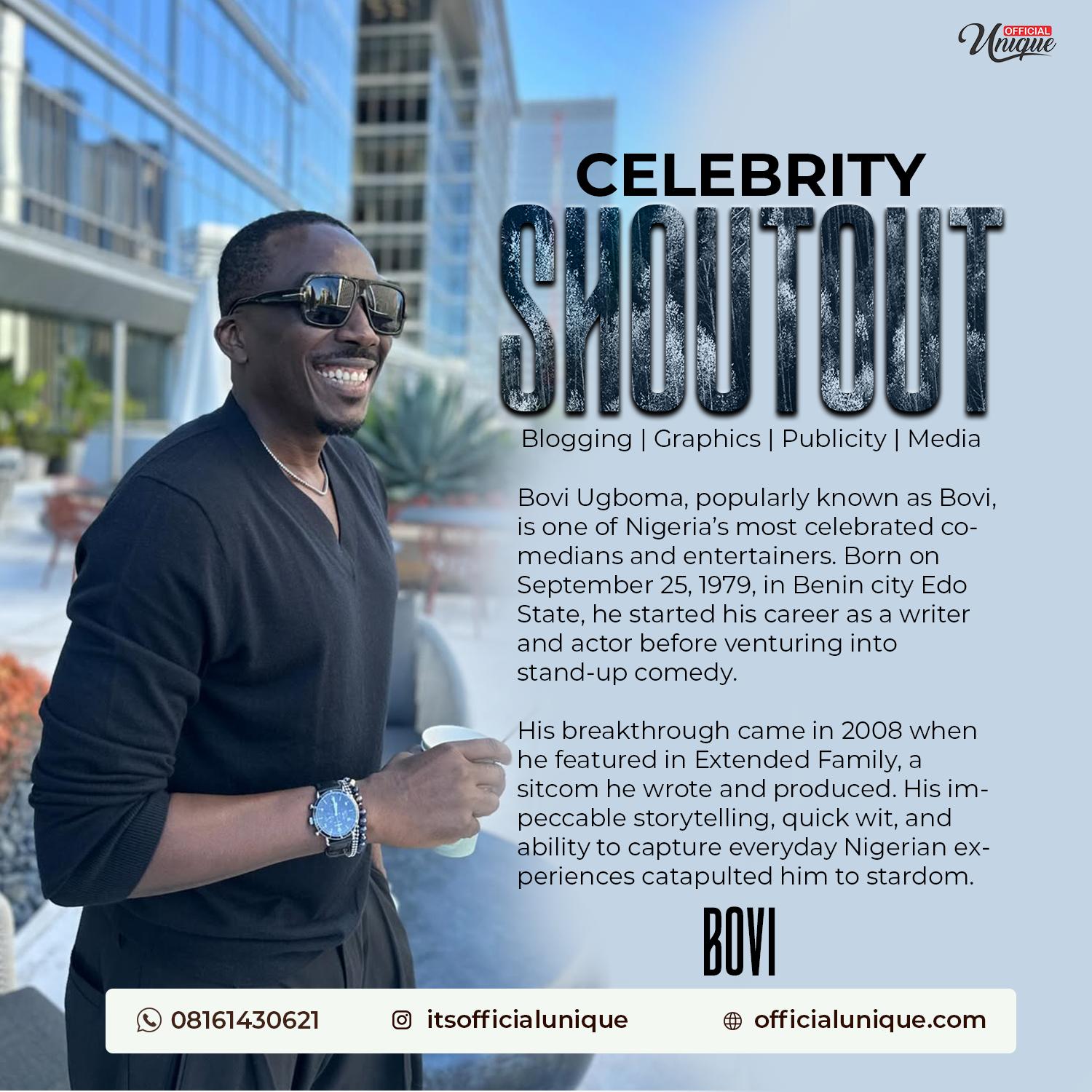 Bovi Ugboma, popularly known as Bovi, is one of Nigeria’s most celebrated comedians and entertainers. Born on September 25, 1979, in Benin city Edo State, he started his career as a writer and actor before venturing into stand-up comedy. His breakthrough came in 2008 when he featured in Extended Family, a sitcom he wrote and produced. His impeccable storytelling, quick wit, and ability to capture everyday Nigerian experiences catapulted him to stardom.