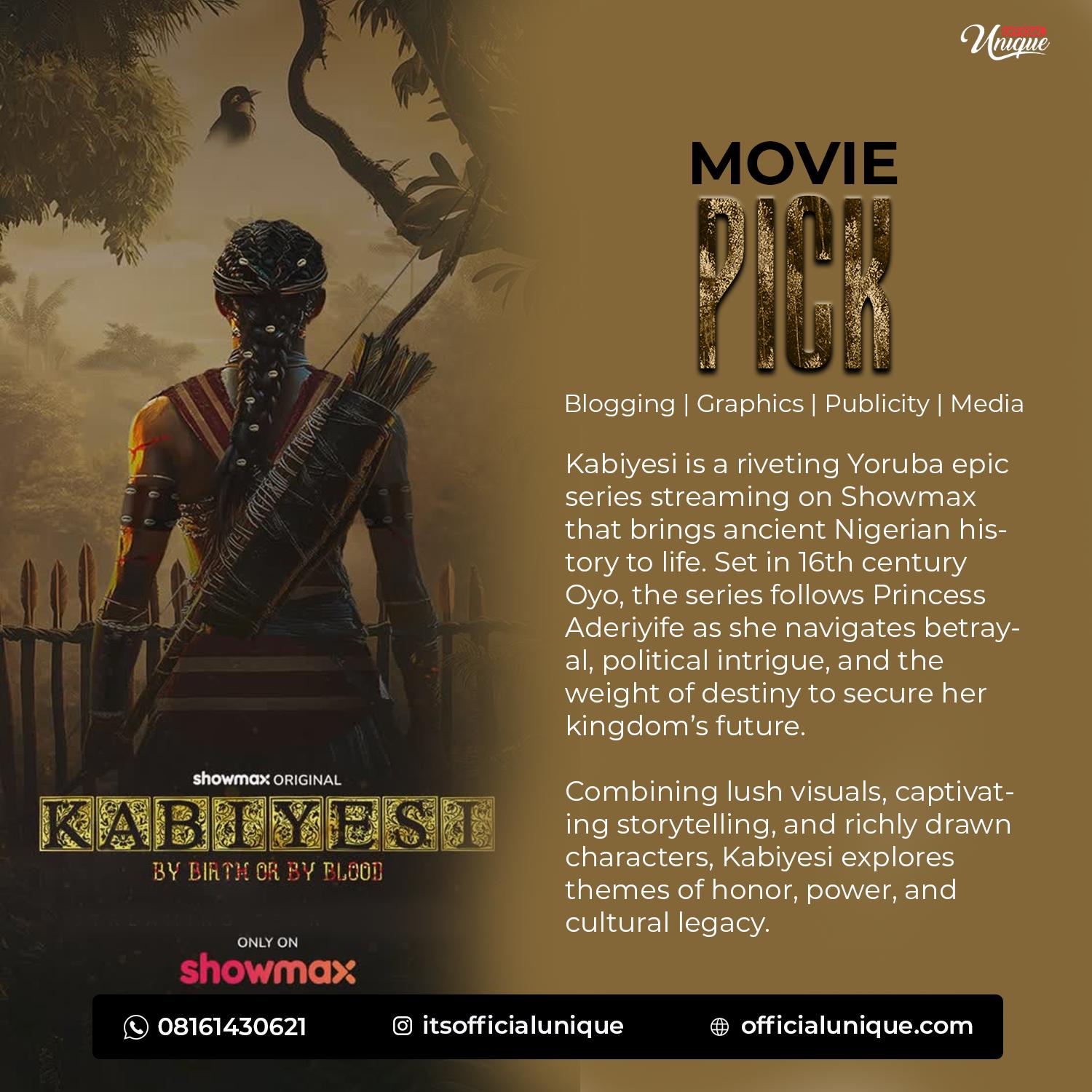 Kabiyesi is a riveting Yoruba epic series streaming on Showmax that brings ancient Nigerian history to life. Set in 16th century Oyo, the series follows Princess Aderiyife as she navigates betrayal, political intrigue, and the weight of destiny to secure her kingdom’s future. Combining lush visuals, captivating storytelling, and richly drawn characters, Kabiyesi explores themes of honor, power, and cultural legacy.
